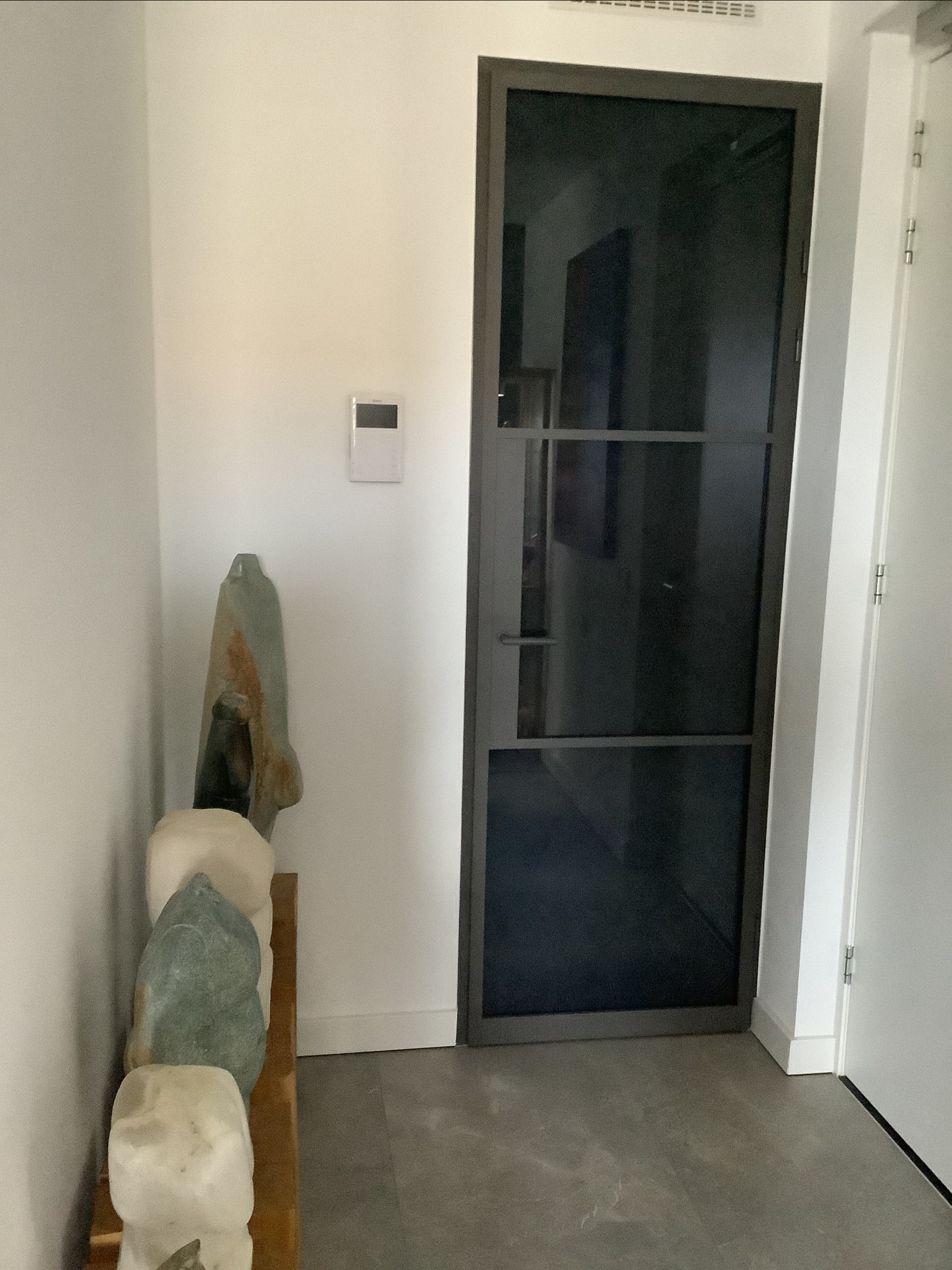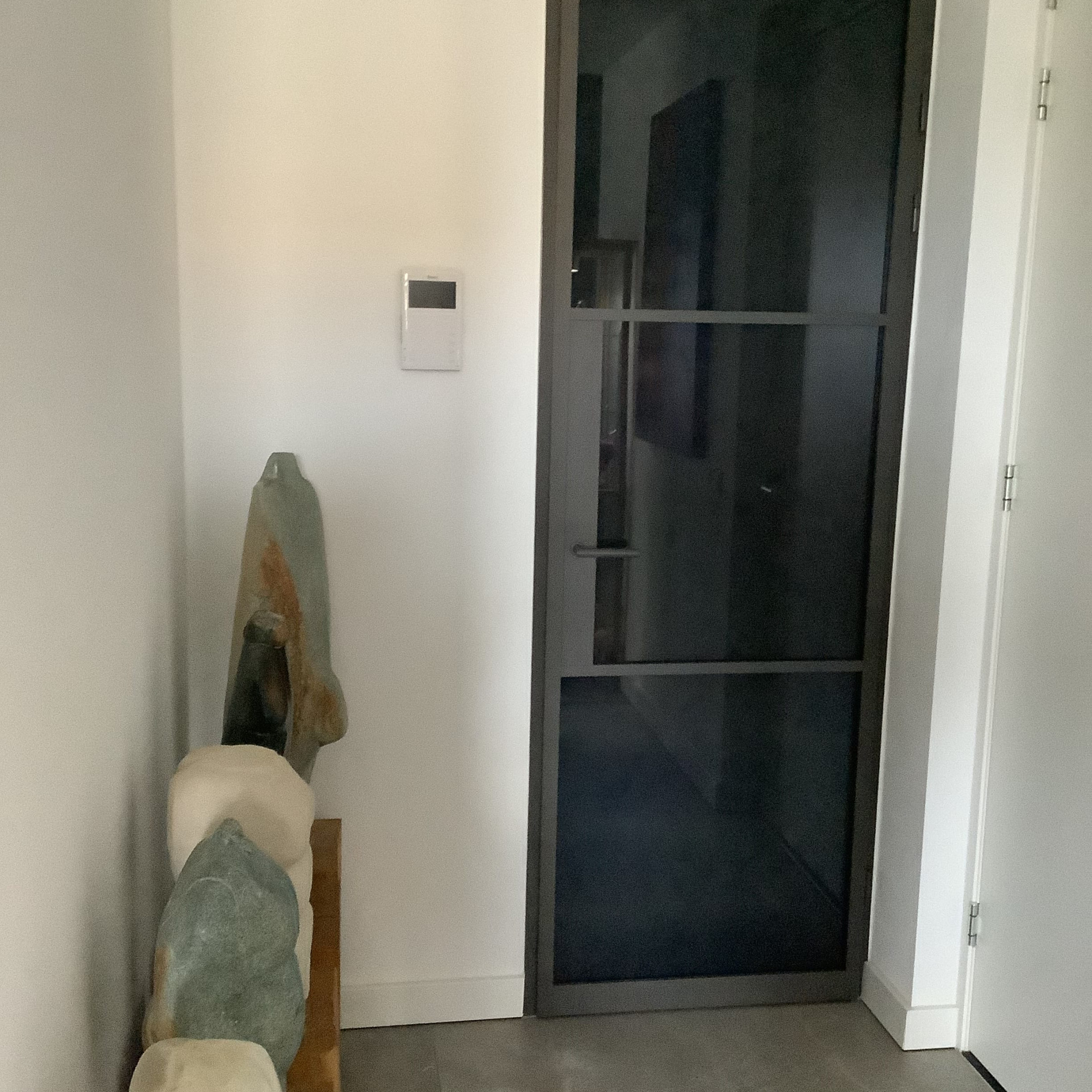 Strakke deur, op maat gemaakt. Staat goed en geeft veel licht door in de overgang van woonkamer naar gang.